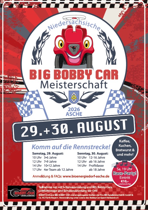 Am 29. & 30.08.2026 bei der Niedersächsischen Big Bobby Car Meisterschaft in Asche.